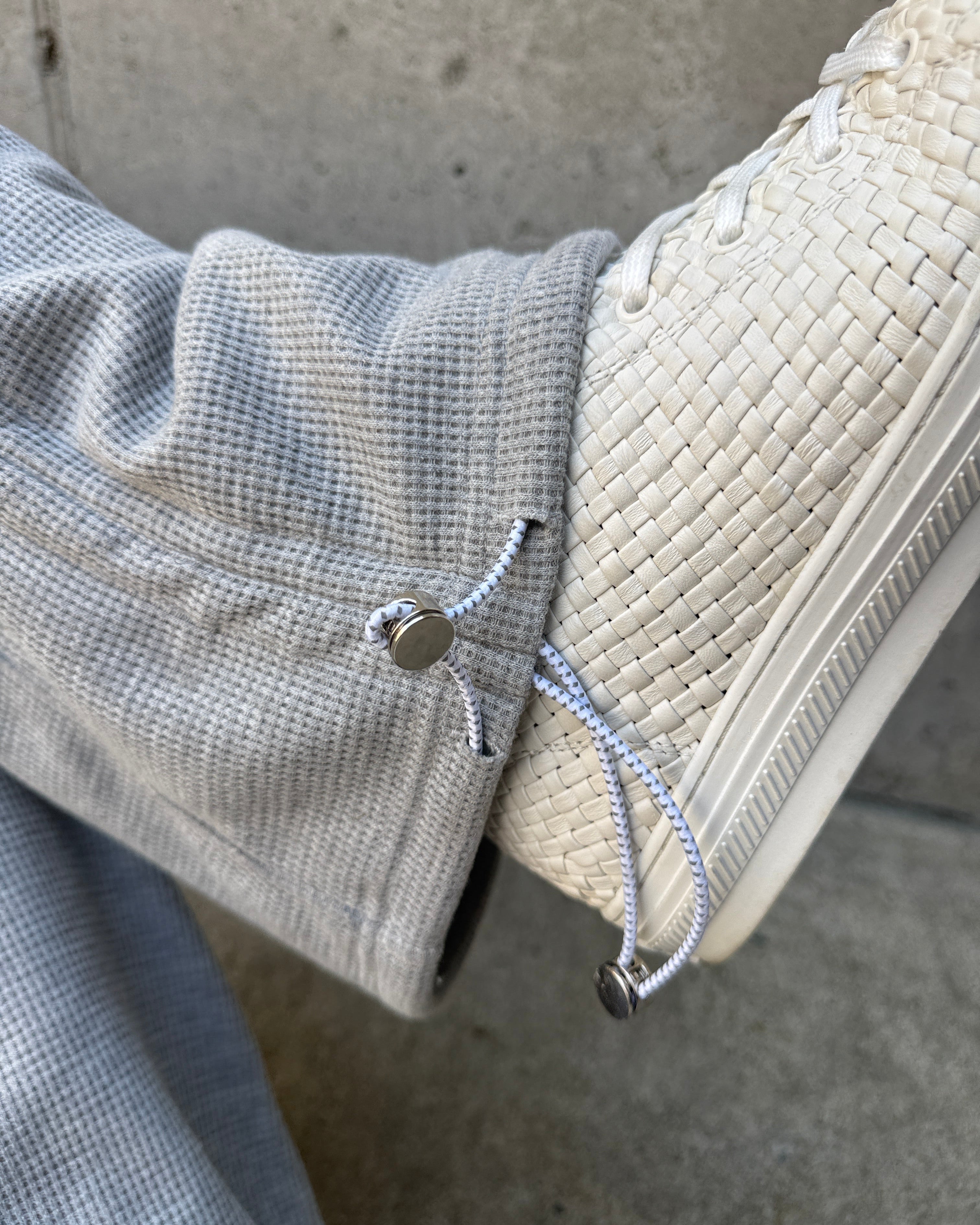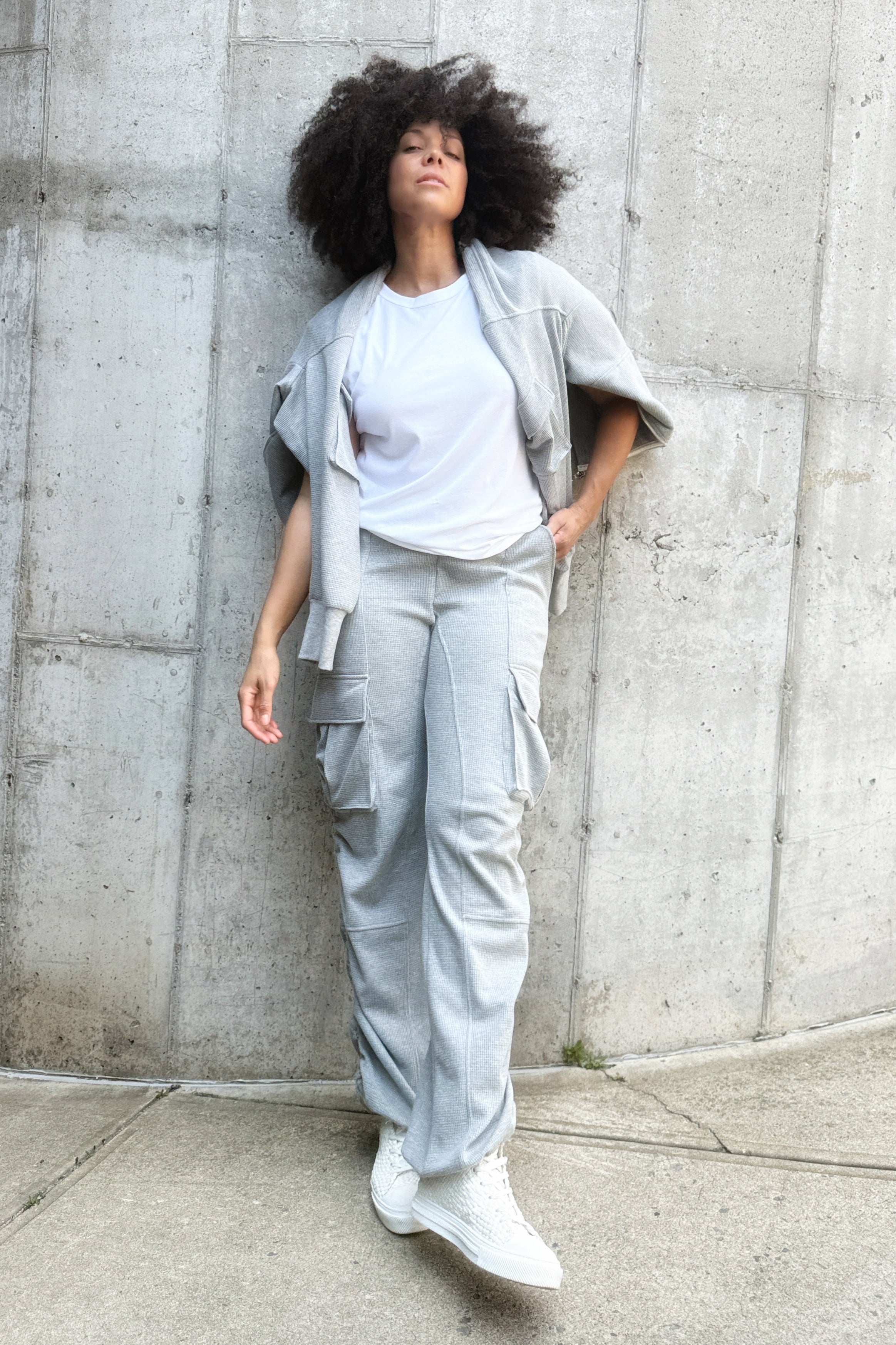 A flexible silhouette with quiet intention. The Waffle Cargo Pant is crafted in a lightweight waffle-knit fleece with a brushed interior — breathable, plush, and soft against the skin. Designed with a relaxed fit and wide leg, it drapes with ease while delivering adaptability through a dual cord-lock system.